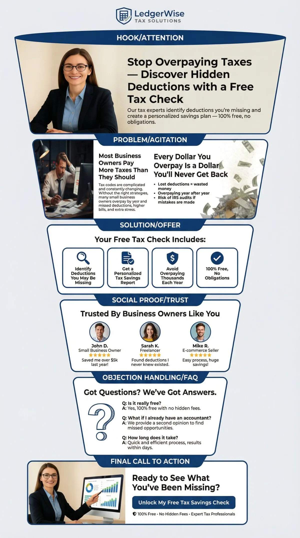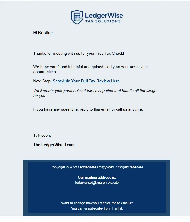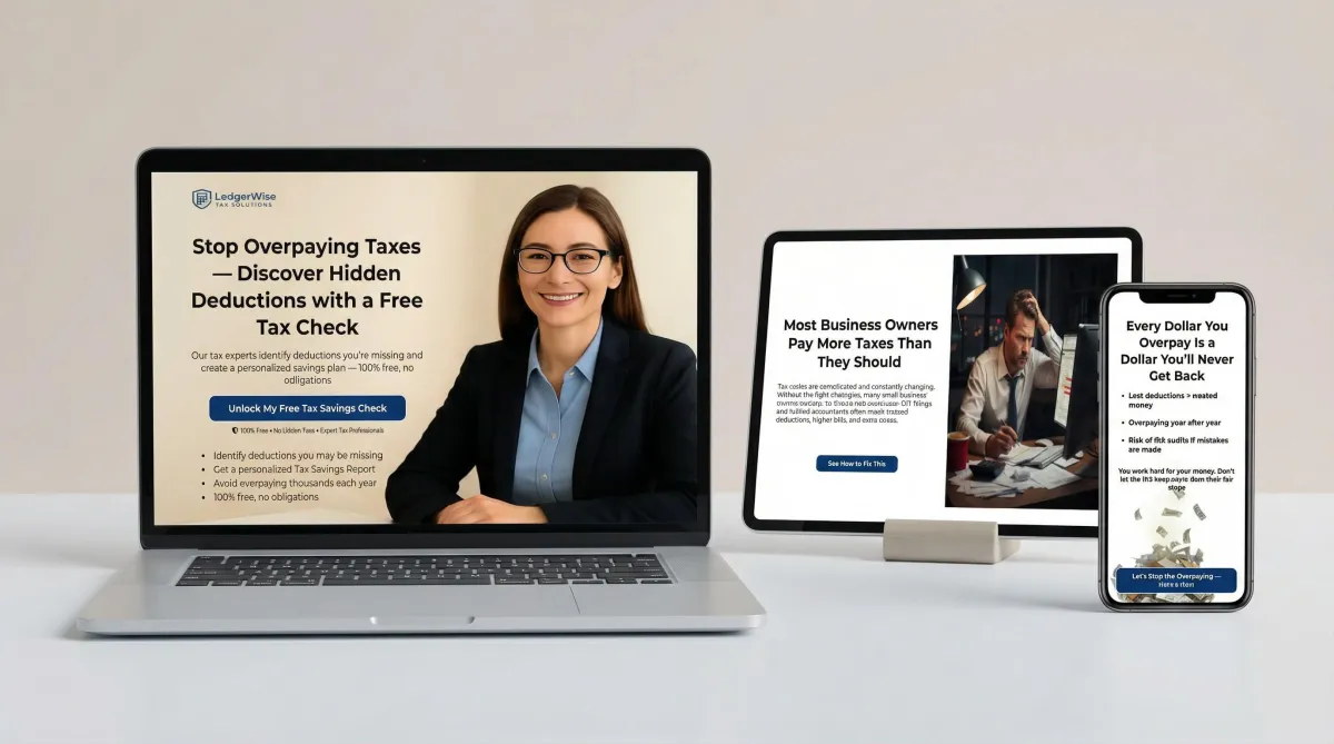 Created a conversion-driven landing page + free tax check lead magnet, added a qualification form with tags and conditional workflows, and implemented a 7-day email + SMS nurture that directs qualified leads to the booking flow.